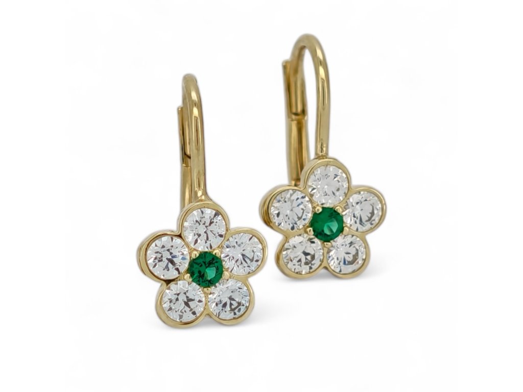 Dámske náušnice zo žltého zlata 585/1000 v tvare kvietku, osadené piatimi čírymi zirkónmi a centrálnym zeleným zirkónom, zapínanie na patent.