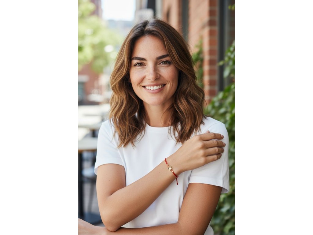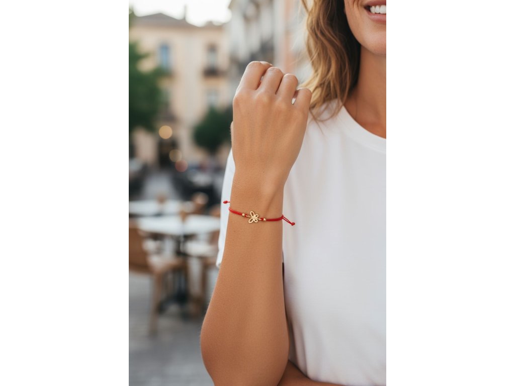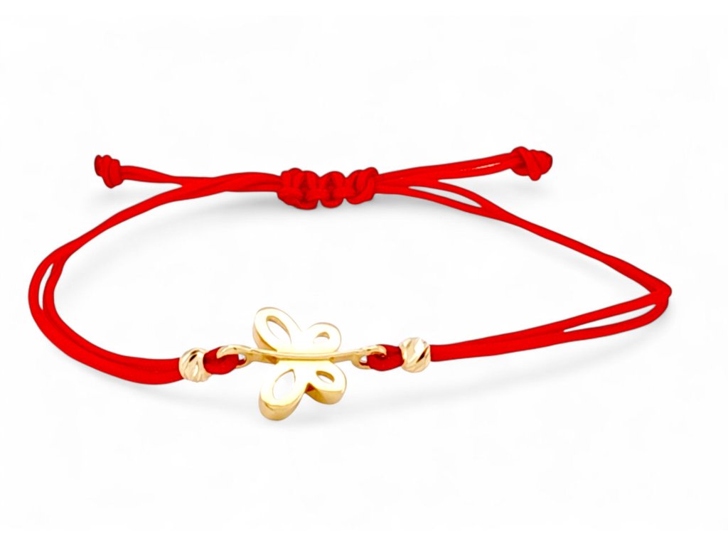 Elegantný červený šnúrkový náramok zdobí motýľ zo 14-karátového žltého zlata (585/1000) – jemný detail, ktorý symbolizuje premenu, slobodu a krásu života. Spojenie sýtej červenej šnúrky a lesklého zlata vytvára harmonický a moderný šperk, ktorý sa hodí ku každému štýlu.