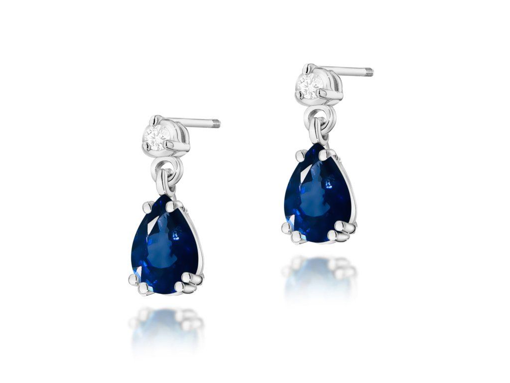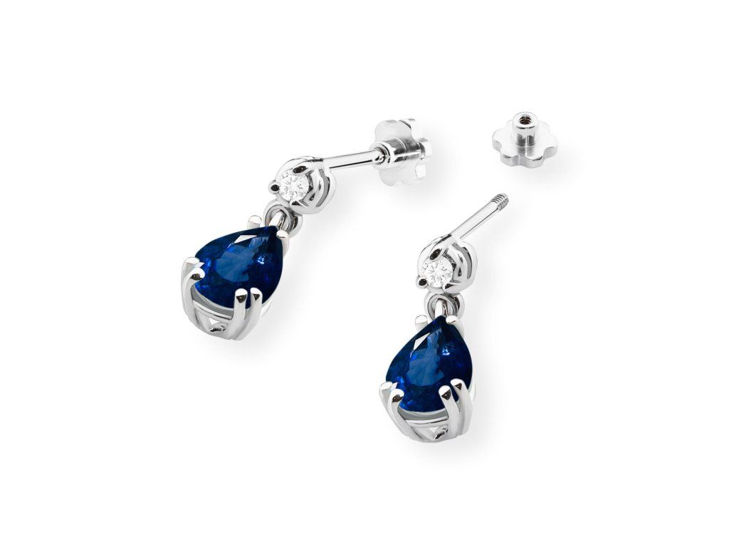 Náušnice z bieleho zlata (Au 585/1000) s dominantným modrým zafírom v tvare kvapky, doplnené briliantovými diamantmi v hornej časti. Zapínanie na balónik.