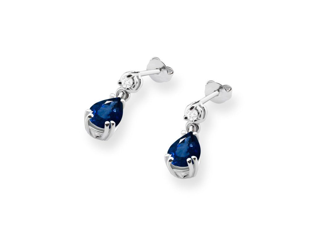 Náušnice z bieleho zlata (Au 585/1000) s dominantným modrým zafírom v tvare kvapky, doplnené briliantovými diamantmi v hornej časti. Zapínanie na puzetu (napichovačky).