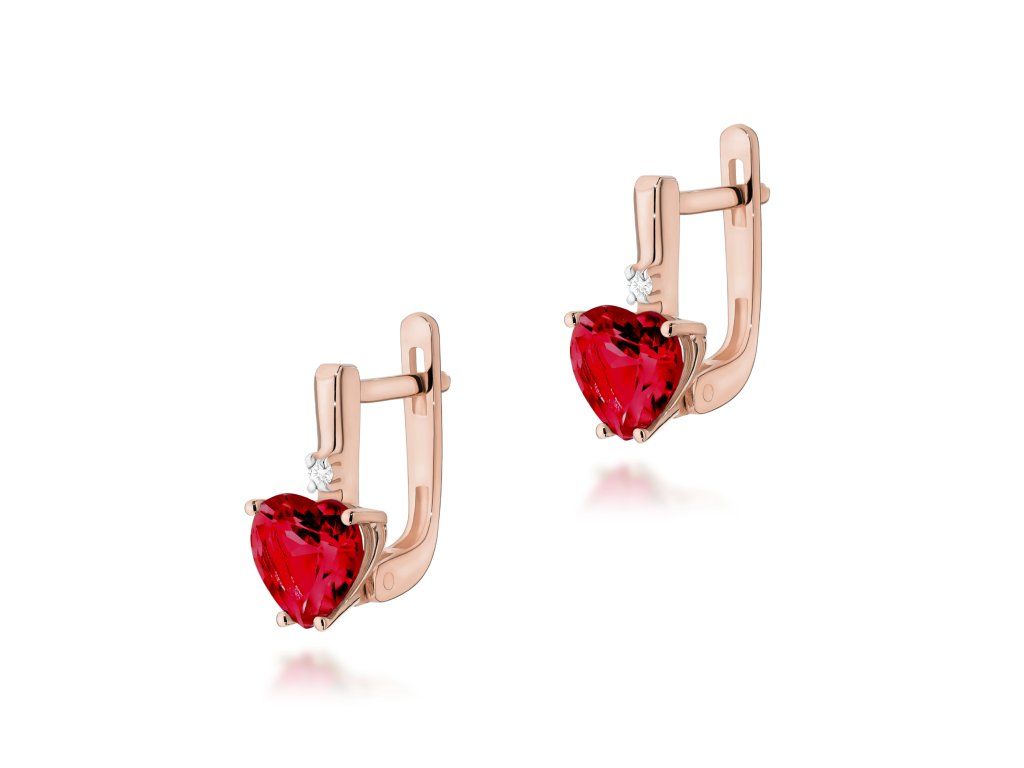 Náušnice sú vyhotovené z ružového zlata rýdzosti 585/1000. Dominantou je prírodný rubín v tvare srdca, doplnený jemnými diamantmi, ktoré zvýrazňujú jeho farbu a lesk.