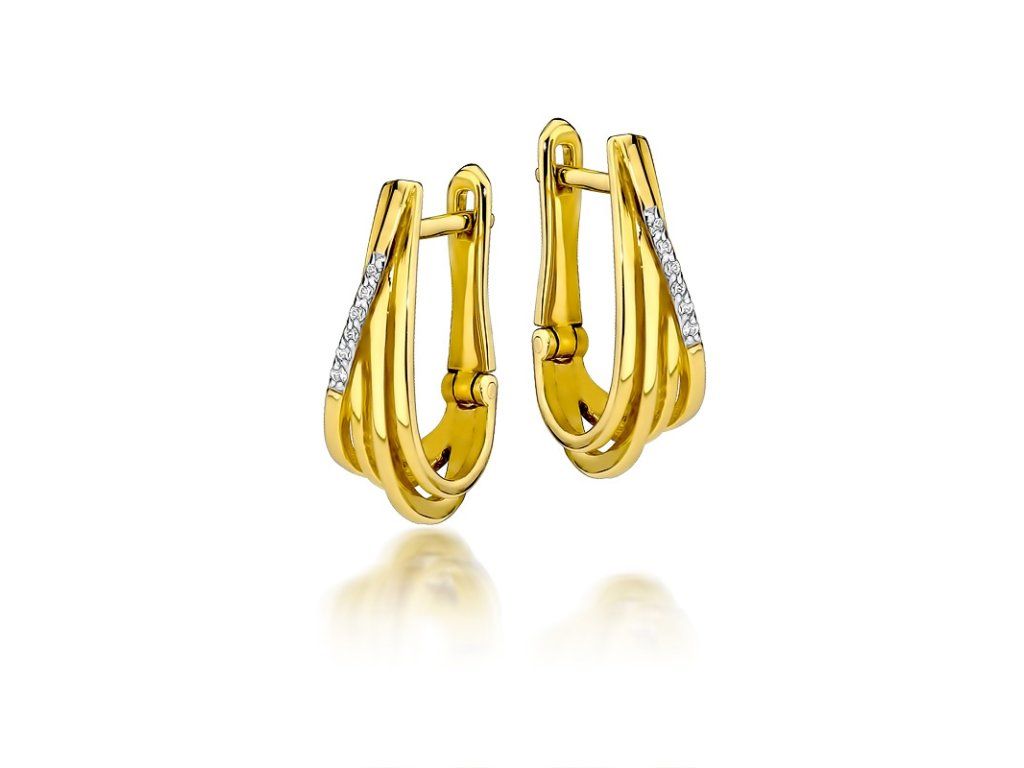 Elegantné náušnice zo žltého zlata (Au 585/1000) zdobené jemnou líniou diamantov. Moderný viacpramenný dizajn vytvára zaujímavý priestorový efekt. Bezpečné zapínanie na anglický patent zabezpečuje pohodlné nosenie počas celého dňa.