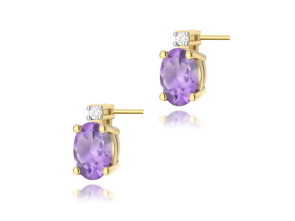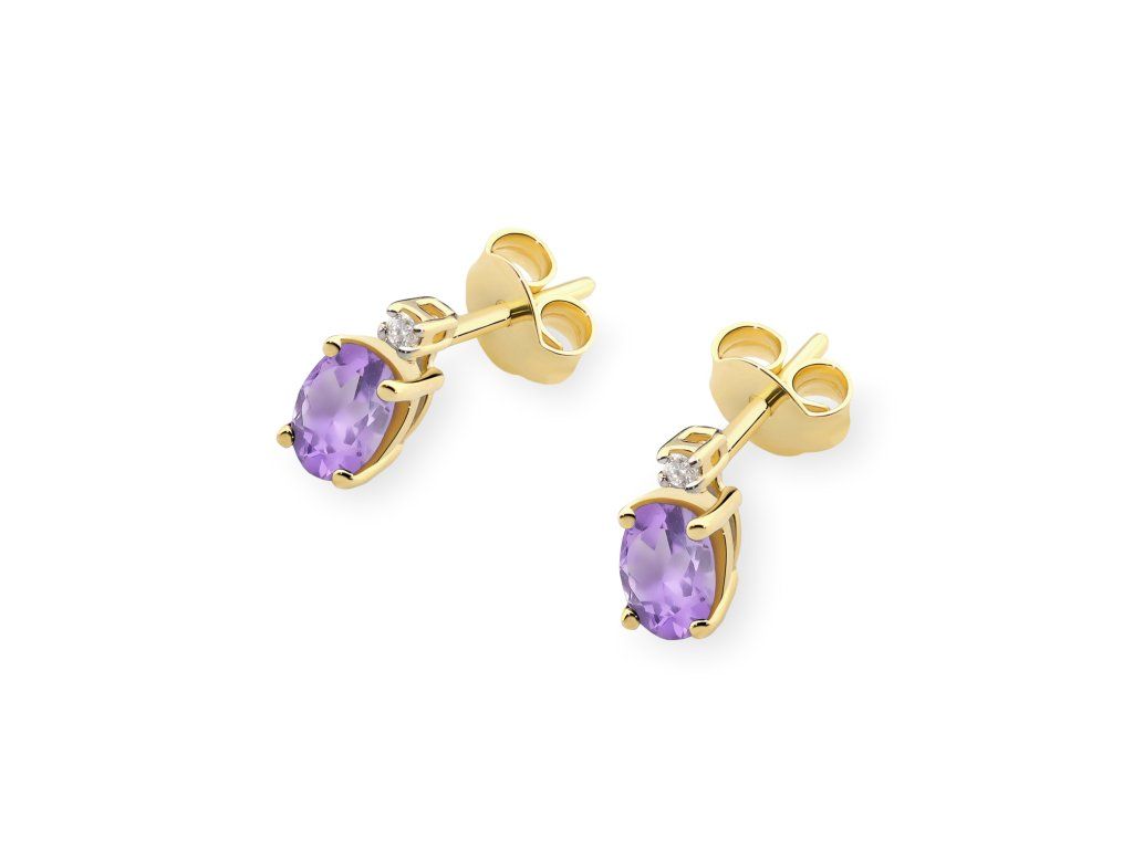 Nádherné diamantové náušnice zo žltého zlata s ametystom a zapínaním na puzetu očaria svojou jemnosťou, eleganciou a romantickým nádychom. Perfektný šperk na každý deň aj výnimočné príležitosti.