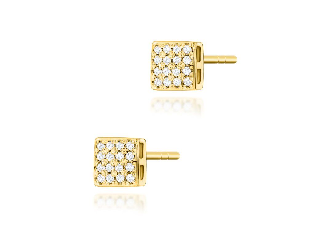 Diamantové náušnice na puzetu zo žltého zlata s moderným štvorcovým motívom, osadeným drobnými diamantmi. Jemný, elegantný a nadčasový šperk vhodný na každodenné nosenie aj výnimočné príležitosti.