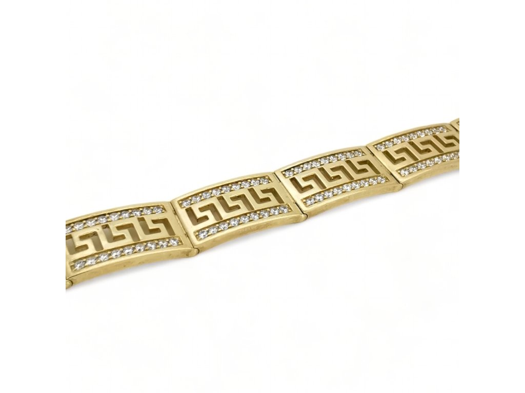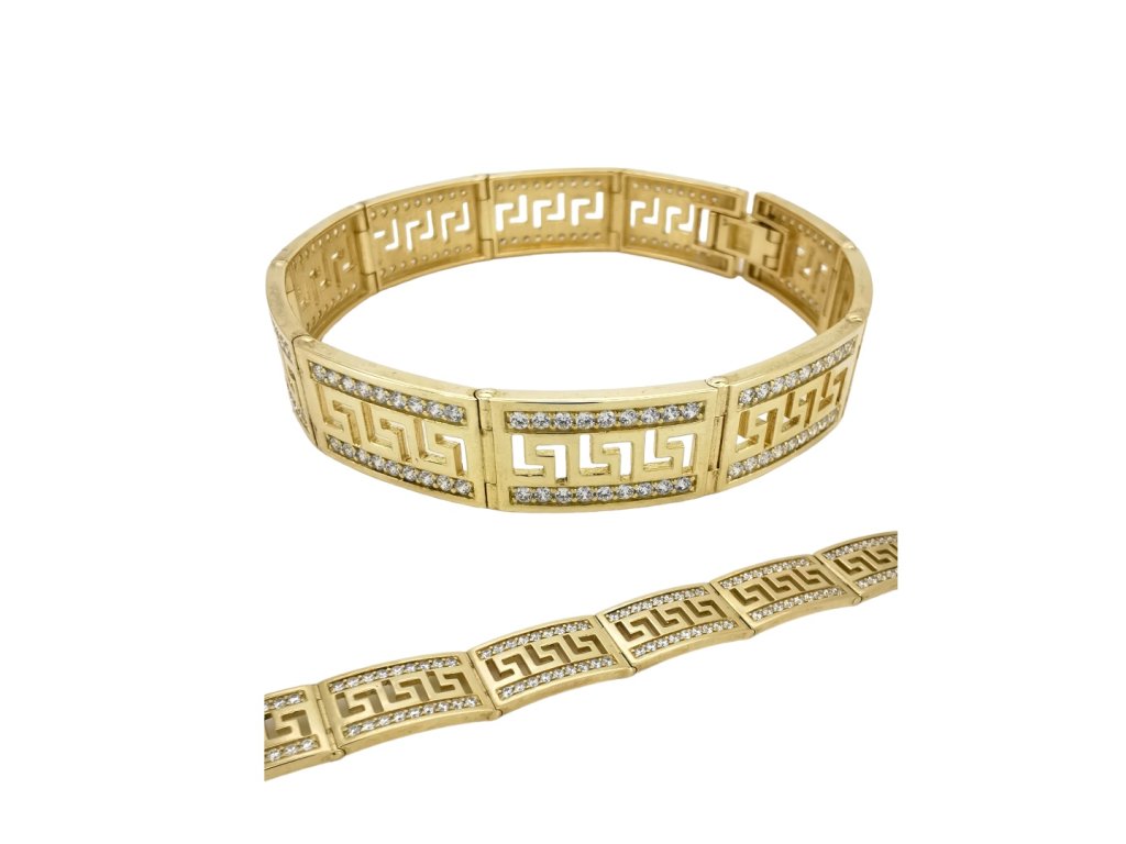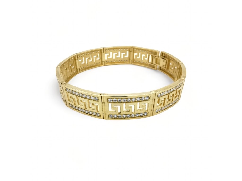 Tento luxusný zlatý náramok s gréckym vzorom zaujme svojím precíznym spracovaním a elegantným dizajnom, ktorý v sebe spája nadčasovosť a jemný dekoratívny detail. Lesk žltého zlata v kombinácii s výrazným ornamentom vytvára harmonický celok, ktorý pôsobí vkusne, štýlovo a veľmi reprezentatívne.