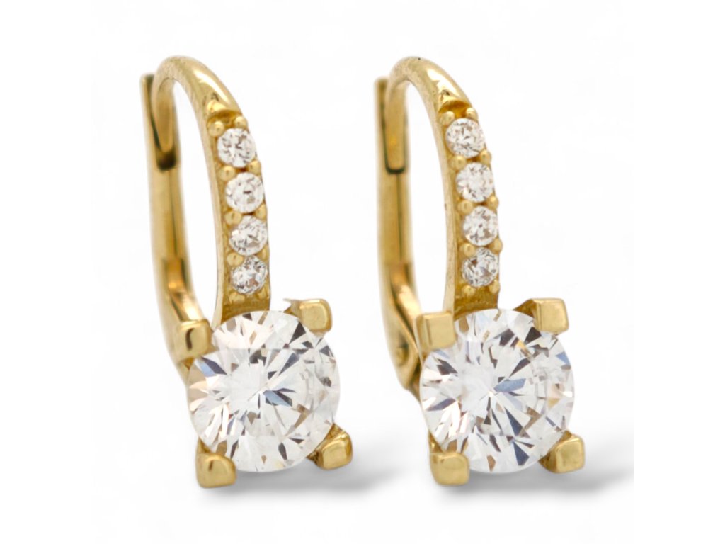 Tieto elegantné náušnice zo žltého zlata 585/1000 sú stelesnením jemnej krásy a klasického štýlu. Dominantný číry zirkón v štvorkrabicovom osadení žiari pri každom pohybe a je dokonale doplnený radom štyroch drobných zirkónov, ktoré dodávajú šperku iskru a noblesu. Starostlivá ručná práca v rodinnom zlatníctve zabezpečuje precízne osadenie kameňov a dlhotrvajúcu kvalitu. Vďaka patentovému zapínaniu náušnice bezpečne držia a pohodlne sa nosia počas celého dňa. Ideálne ako darček pre výnimočnú ženu alebo ako doplnok na špeciálne príležitosti. Objavte poctivé remeslo a nadčasový dizajn, ktorý si zamilujete.