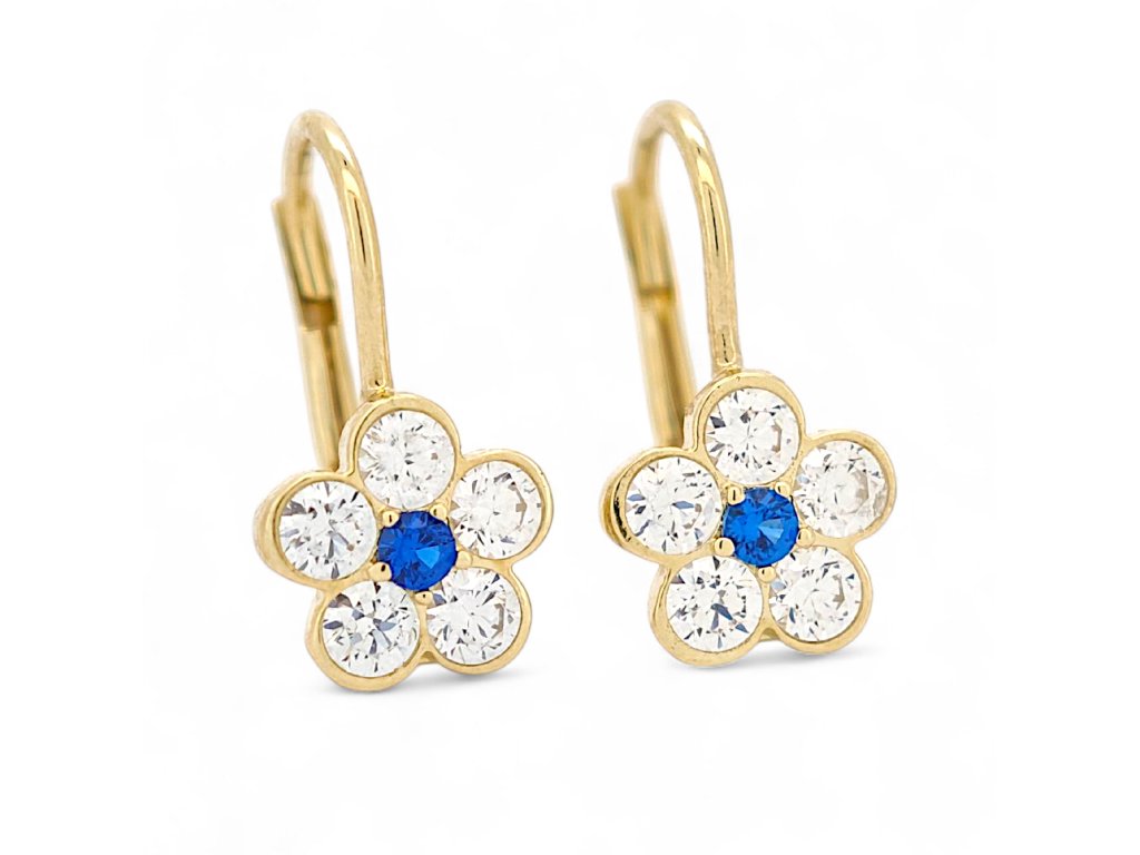 Detské náušnice zo žltého zlata 585/1000 v tvare kvetinky, zdobené čírymi zirkónmi a modrým stredovým kamienkom, zapínanie na klasický patent.