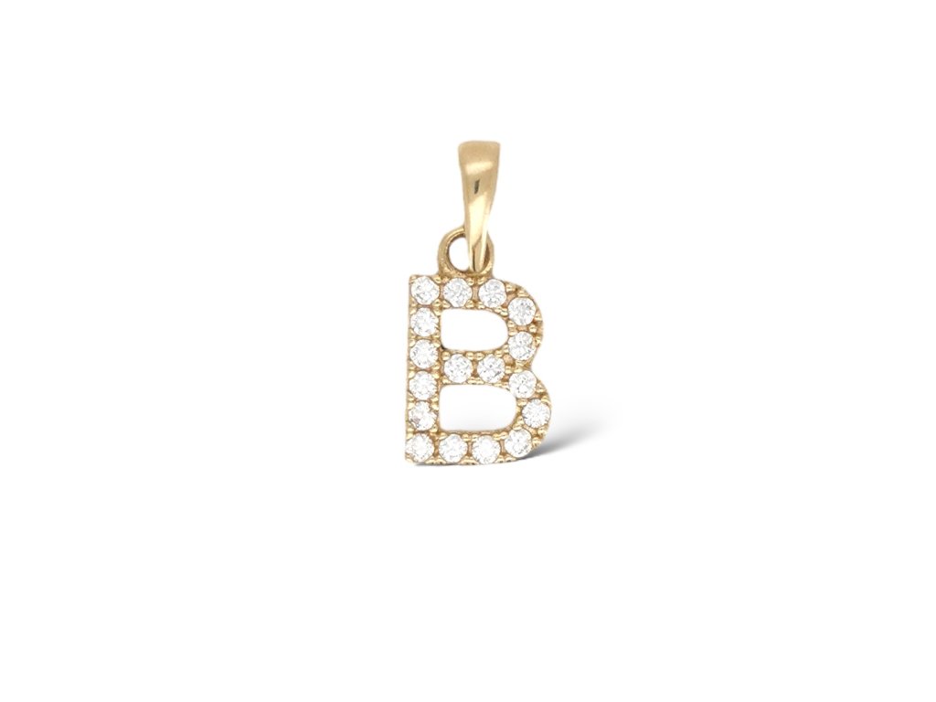 Zlatý prívesok písmeno B so zirkónmi zo 14-karátového žltého zlata (585/1000). Elegantný osobný doplnok na každodenné nosenie.