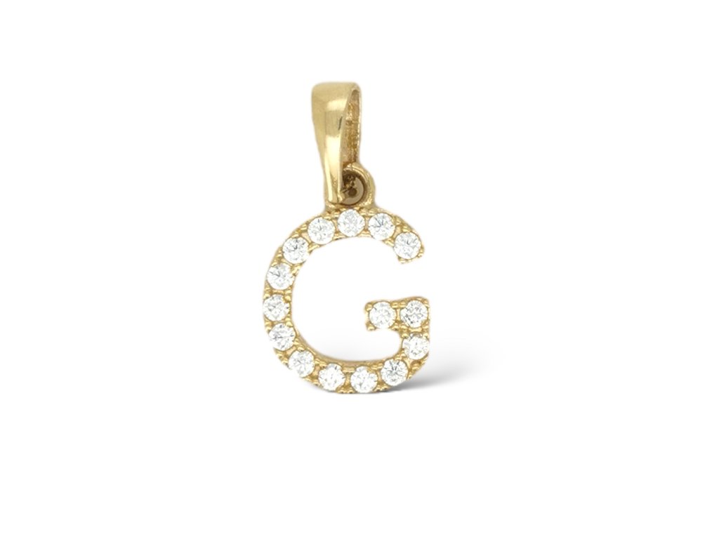 Zlatý prívesok písmeno G so zirkónmi zo 14-karátového žltého zlata (585/1000). Elegantný osobný doplnok na každodenné nosenie.