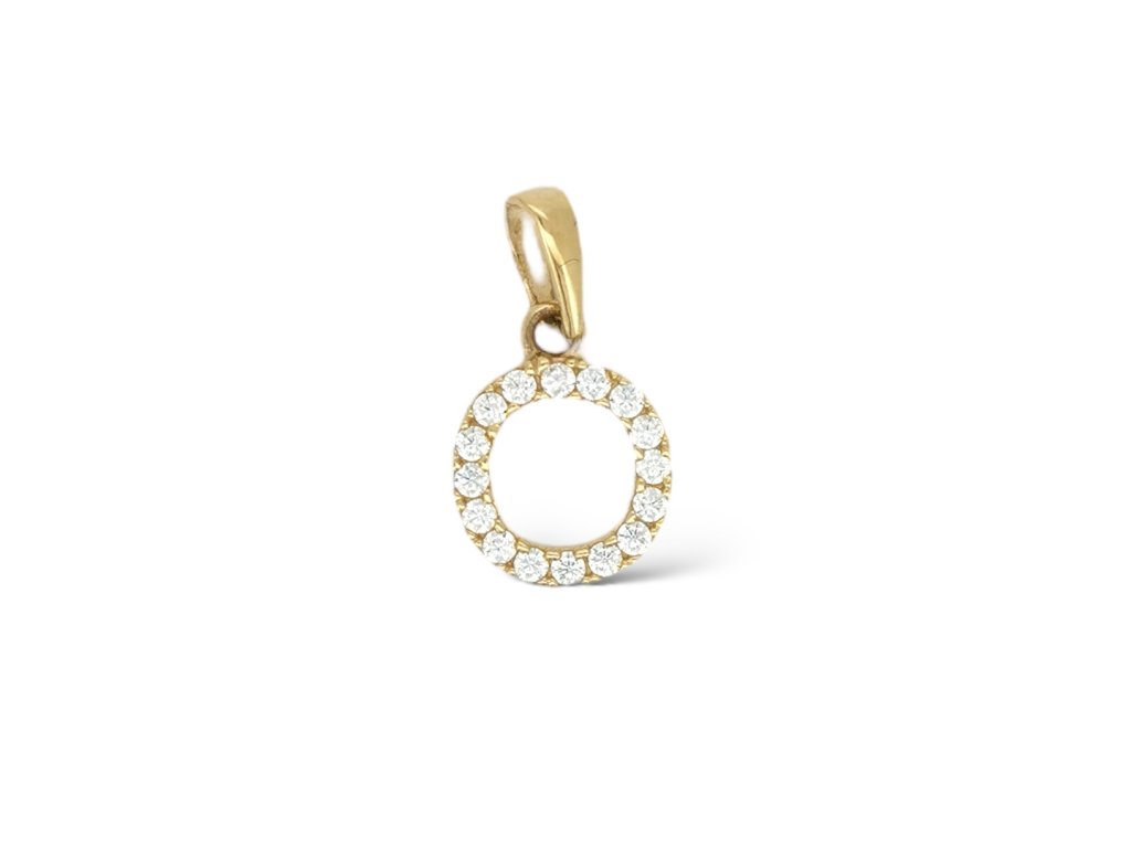 Prívesok v tvare písmena O je vyrobený z pravého 14-karátového zlata a zdobený drobnými trblietavými zirkónmi, ktoré mu dodávajú jemný lesk. Kamienky zvýrazňujú jeho tvar a vytvárajú vkusný, nadčasový vzhľad.