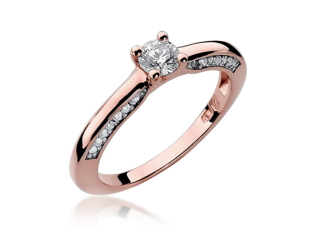 Diamantový prsteň z ružového zlata (585/1000) s centrálnym diamantom 0,30 ct, doplnený 28 diamantmi na obrúčke. Luxusný a elegantný šperk.