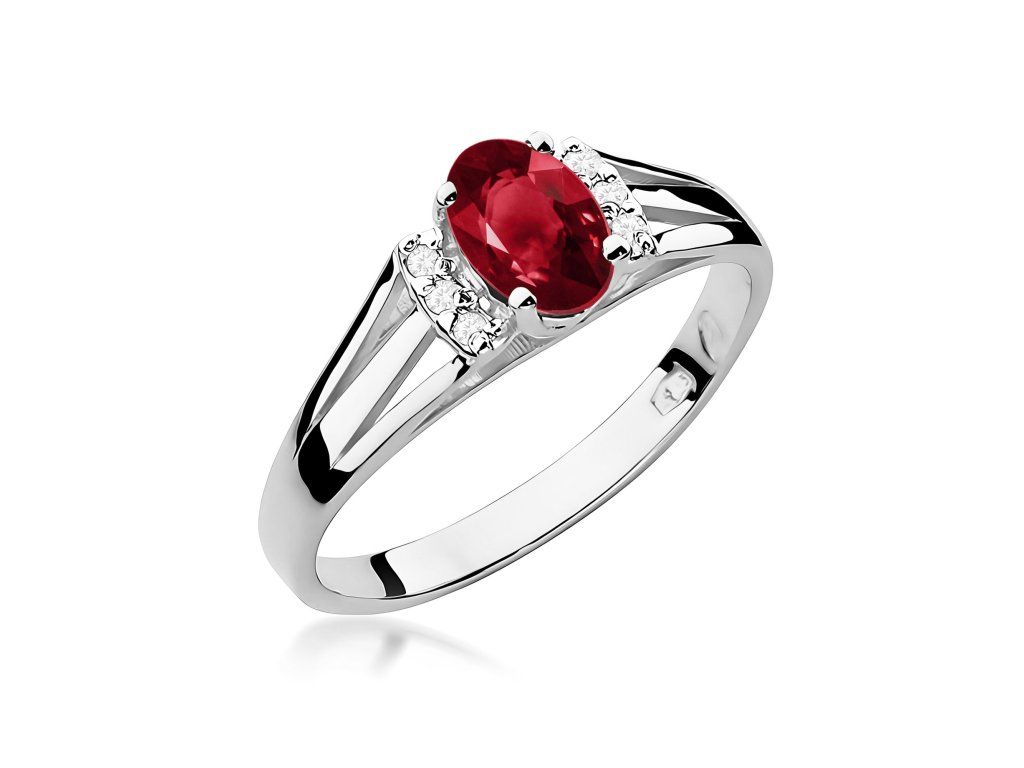 Prsteň s granátom z bieleho zlata (585/1000) s kameňom 0,50 ct, doplnený 6 diamantmi. Elegantný šperk s výraznou farbou.