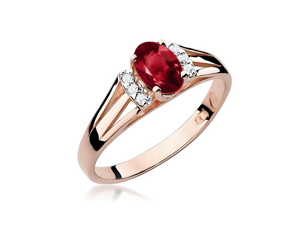 Prsteň s granátom z ružového zlata (585/1000) s kameňom 0,50 ct, doplnený 6 diamantmi. Elegantný a výrazný šperk.