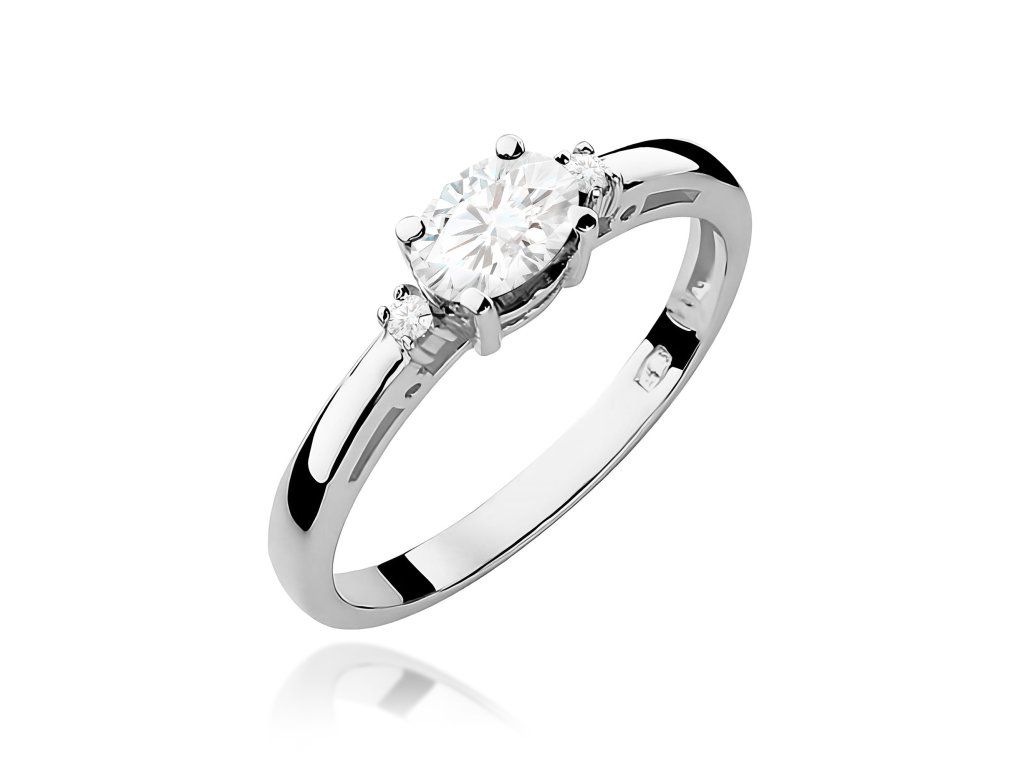 Prsteň s laboratórnym diamantom z bieleho zlata (585/1000) s kameňom 0,40 ct, doplnený 2 diamantmi. Elegantný a nadčasový šperk.