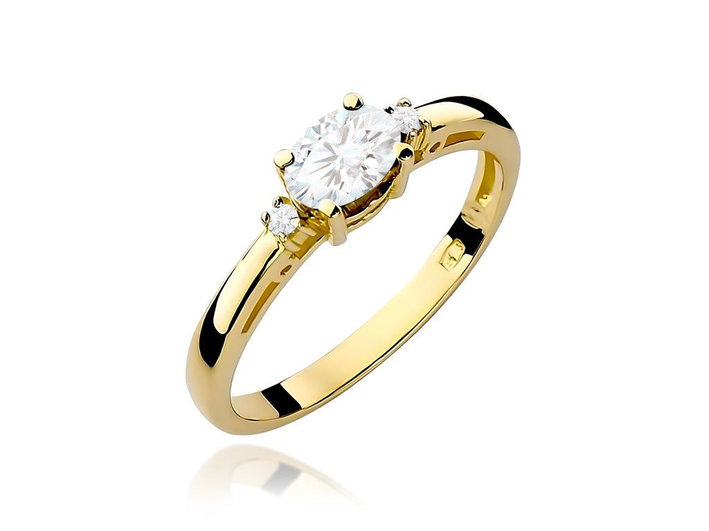 Prsteň s laboratórnym diamantom zo žltého zlata (585/1000) s kameňom 0,40 ct, doplnený 2 diamantmi. Elegantný a moderný šperk.