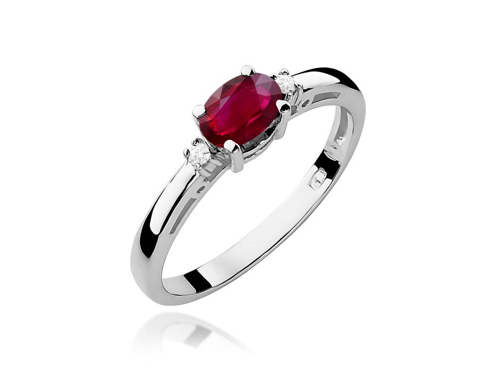 Prsteň s rubínom z bieleho zlata (585/1000) s kameňom 0,60 ct, doplnený 2 diamantmi. Elegantný a výrazný šperk.