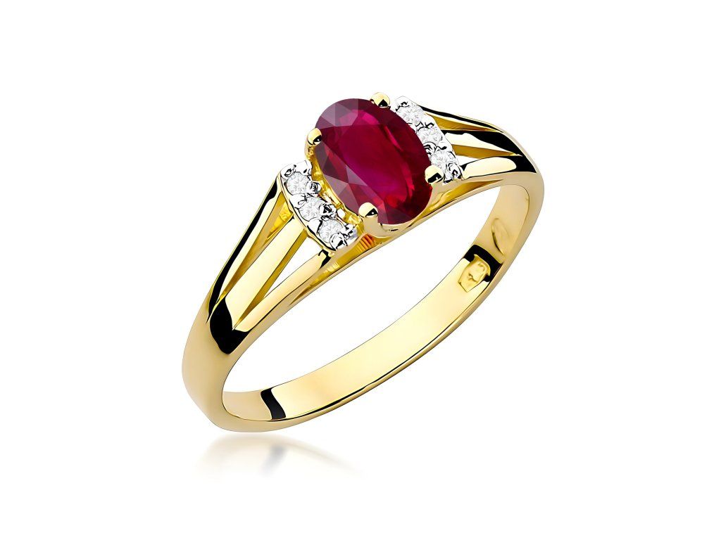 Prsteň s rubínom zo žltého zlata (585/1000) s kameňom 0,60 ct, doplnený 6 diamantmi. Luxusný a výrazný šperk.