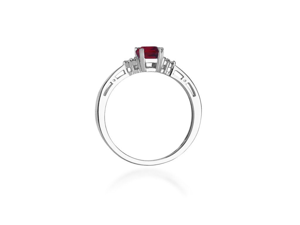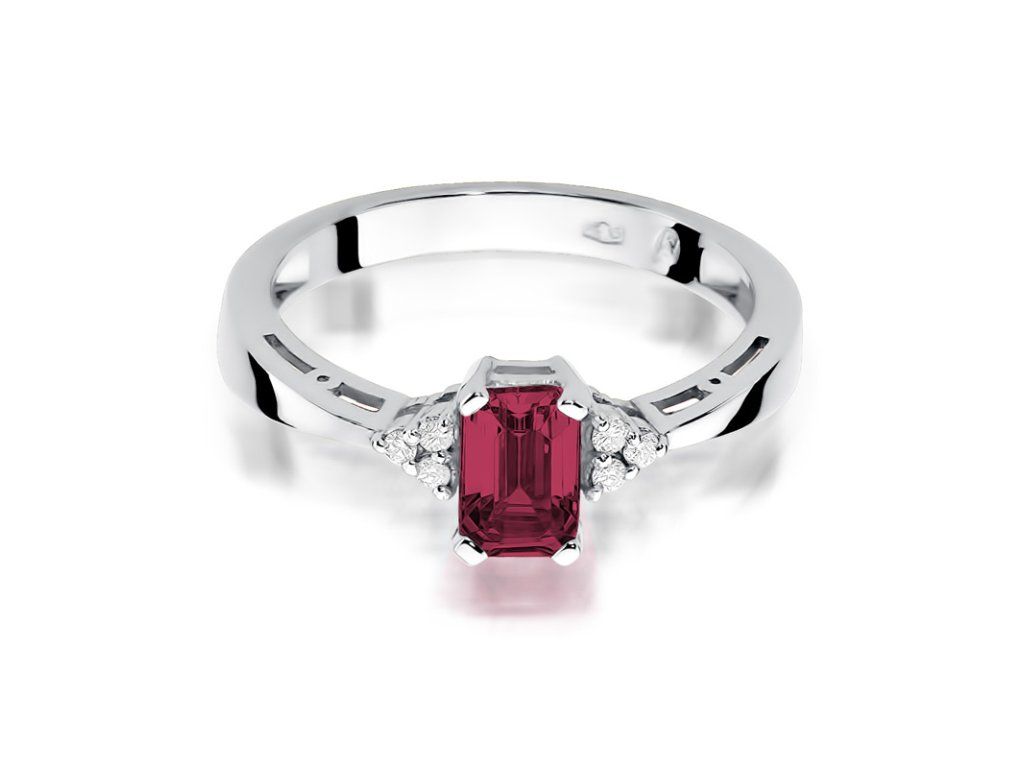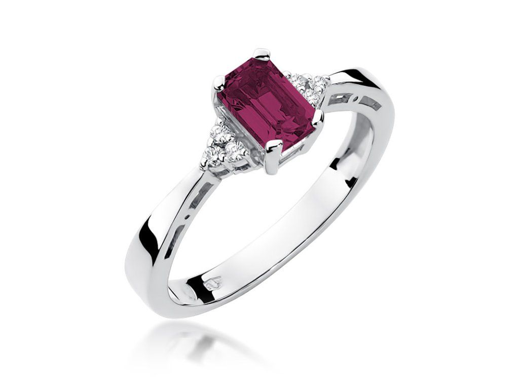 Prsteň s rubínom z bieleho zlata (585/1000) s kameňom 0,80 ct, doplnený diamantmi. Luxusný a výrazný šperk.