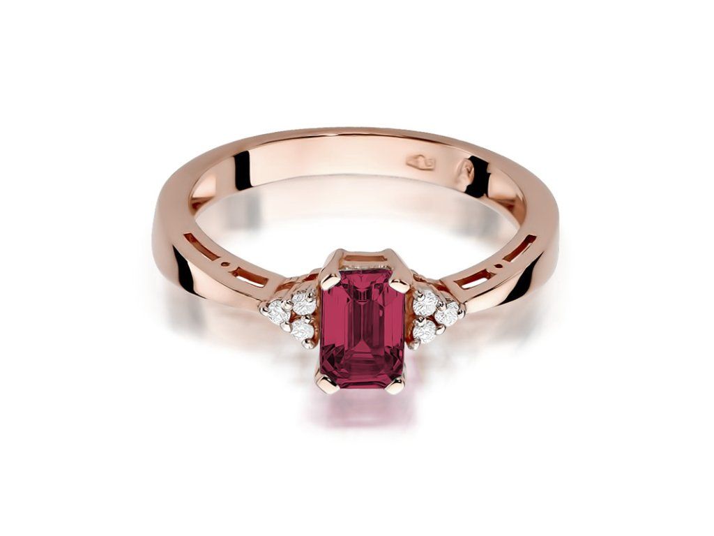 Prsteň s rubínom z ružového zlata (585/1000) s kameňom 0,80 ct, doplnený diamantmi. Luxusný a výrazný šperk.
