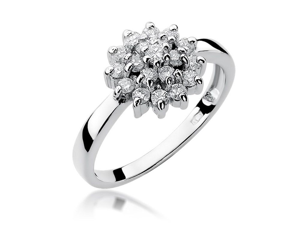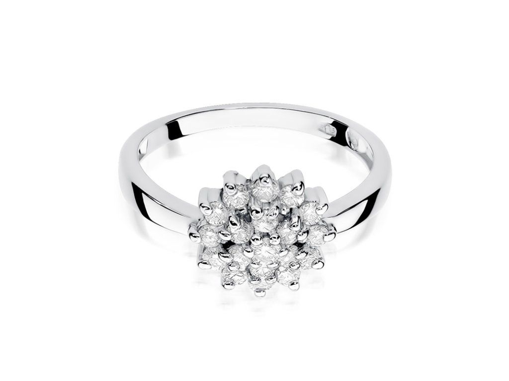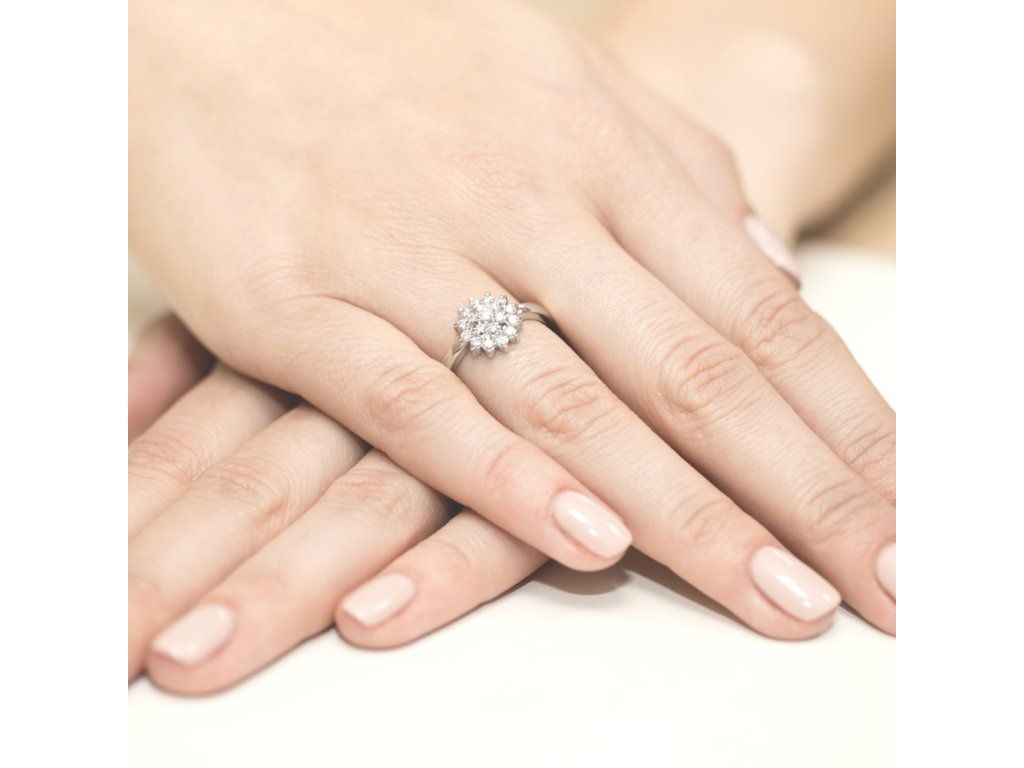 Luxusný prsteň z pravého bieleho zlata zdobí centrálny diamant, ktorý je obklopený 18 drobnými diamantmi, vytvárajúcimi efekt žiarivej koruny. Toto precízne osadenie zvýrazňuje lesk hlavného kameňa a dodáva šperku výnimočný, luxusný vzhľad.