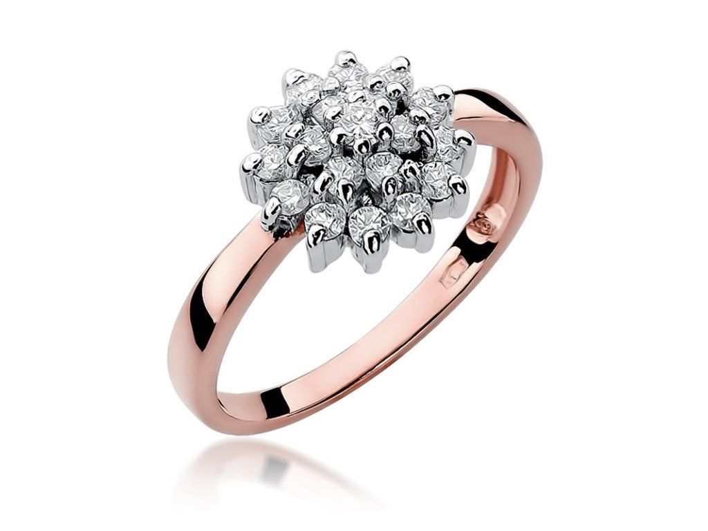 Diamantový prsteň z ružového zlata (585/1000) s jedným centrálnym diamantom a 18 diamantmi okolo. Luxusný a elegantný šperk.