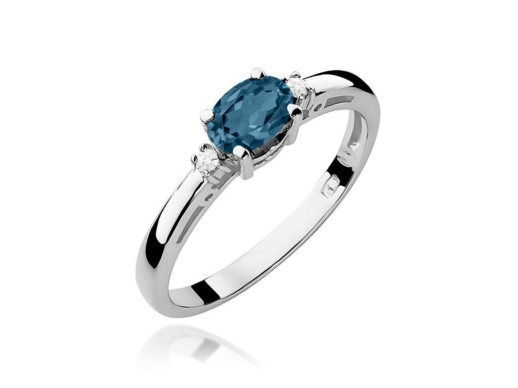 Prsteň s topásom London Blue z bieleho zlata (585/1000) s kameňom 0,50 ct, doplnený 2 diamantmi. Elegantný šperk s výraznou farbou.