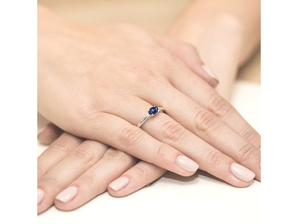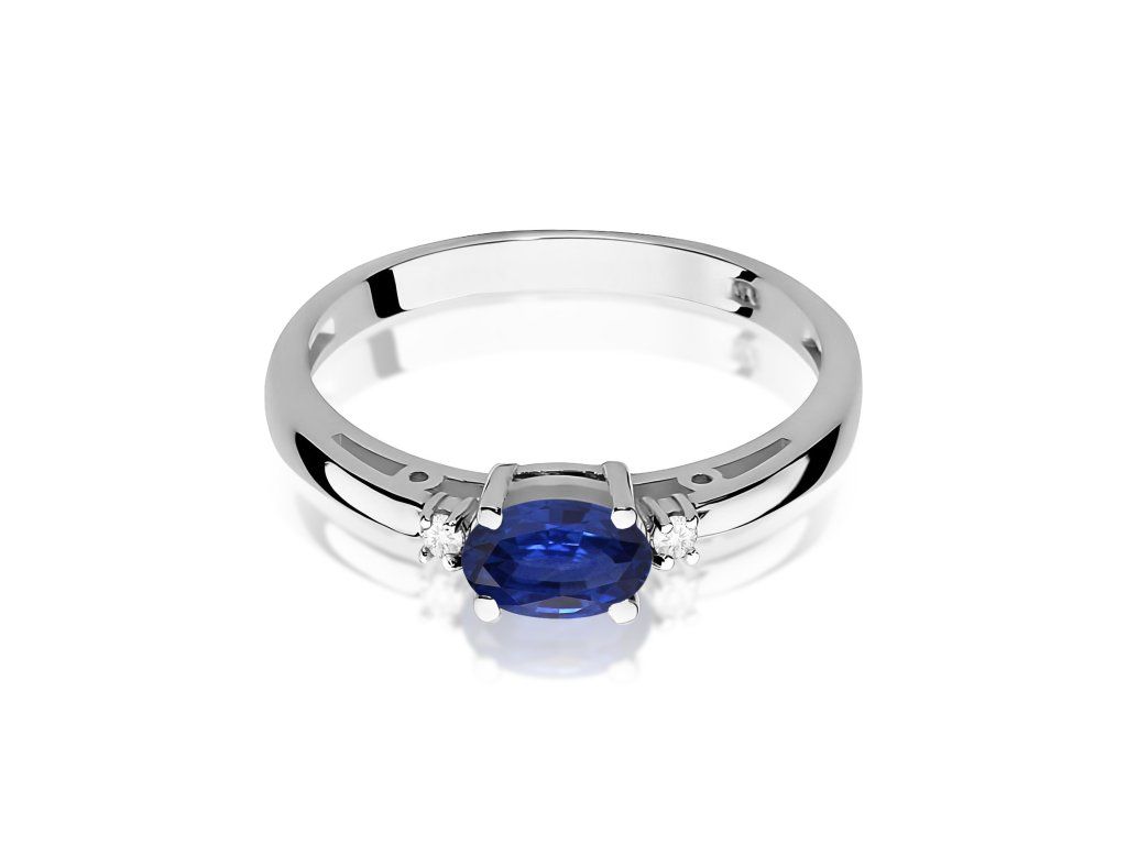 Prsteň so zafírom z bieleho zlata (585/1000) s kameňom 0,70 ct, doplnený 2 diamantmi. Elegantný a luxusný šperk.