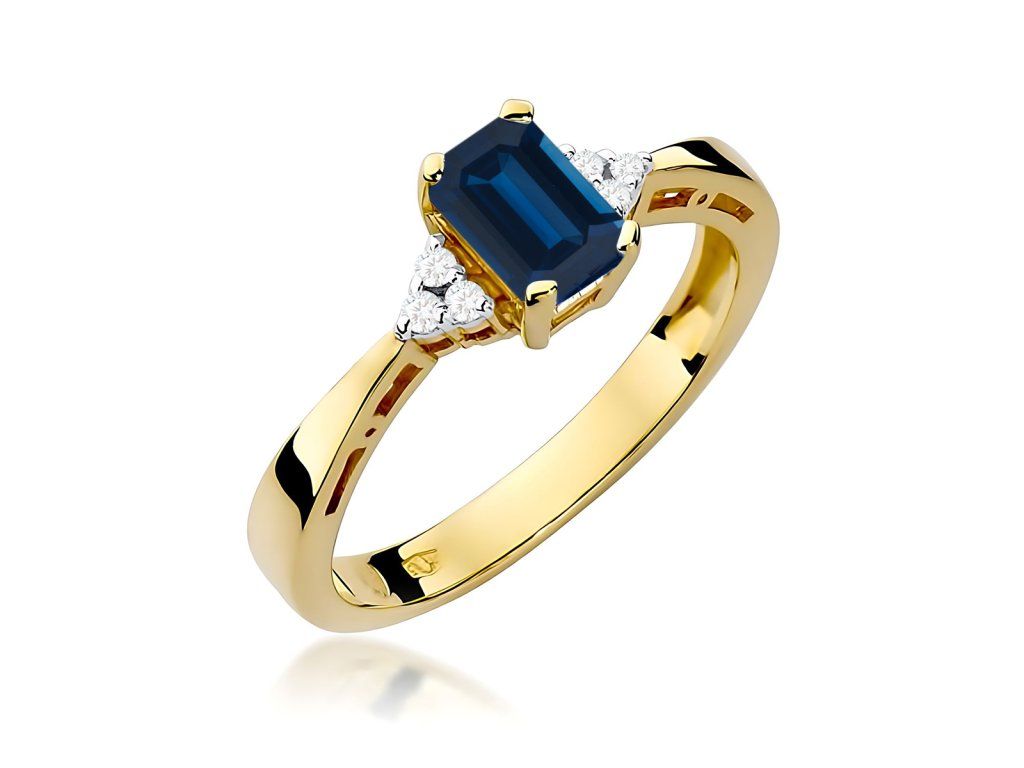 Prsteň so zafírom zo žltého zlata (585/1000) s kameňom 0,60 ct, doplnený diamantmi. Elegantný a nadčasový šperk.