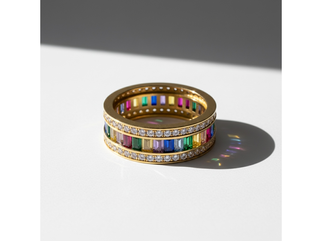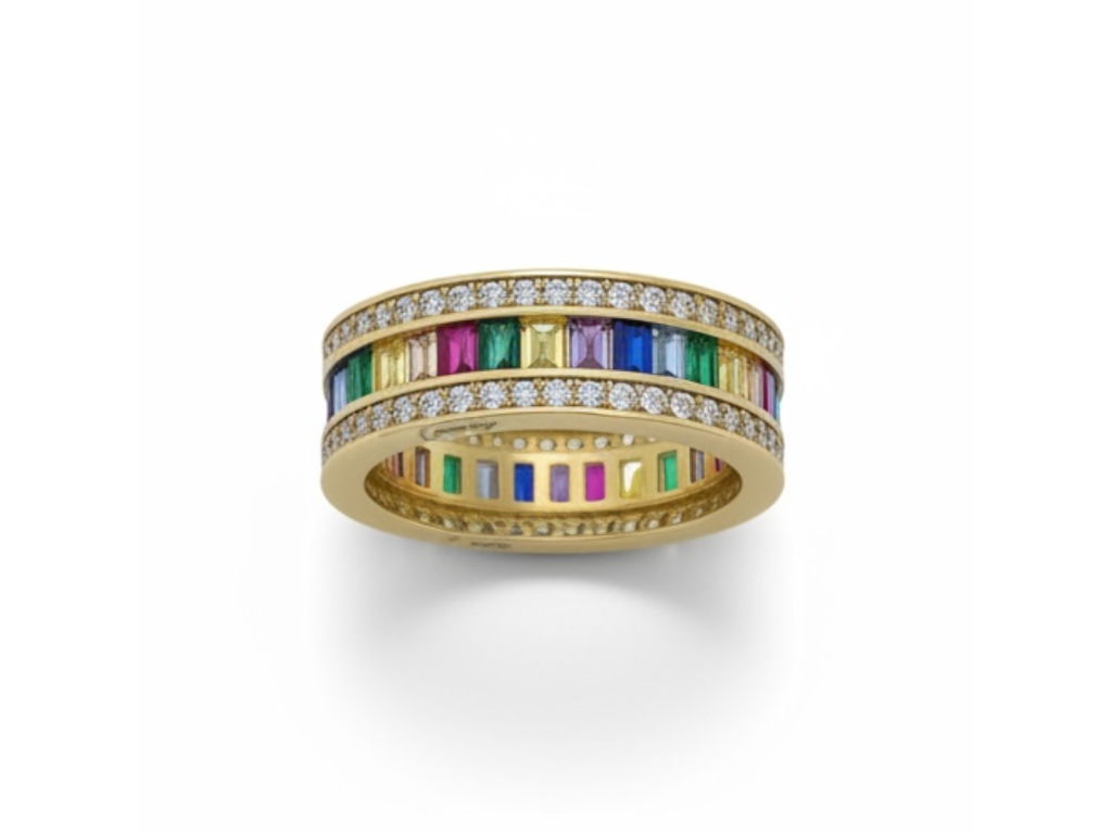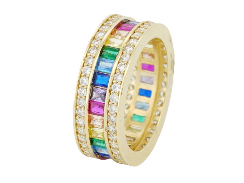 Prsteň z pravého 14-karátového žltého zlata zdobia farebné zirkóny usporiadané v dúhovom spektre, ktoré sú po obvode jemne olemované čírymi zirkónmi. Táto kombinácia vytvára krásny kontrast farieb a zároveň dodáva šperku výrazný lesk a luxusný vzhľad.