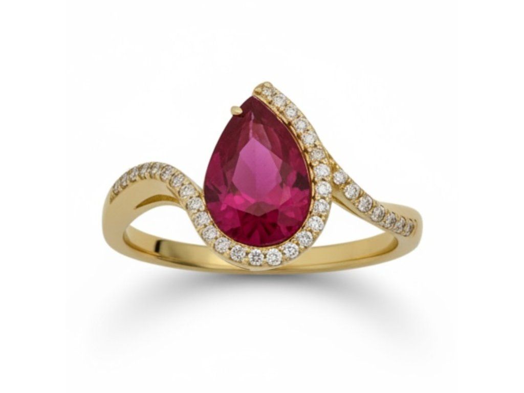 Prsteň zo žltého zlata s výrazným tmavoružovým zirkónom v tvare slzy a postrannými čírymi kamienkami. 💖