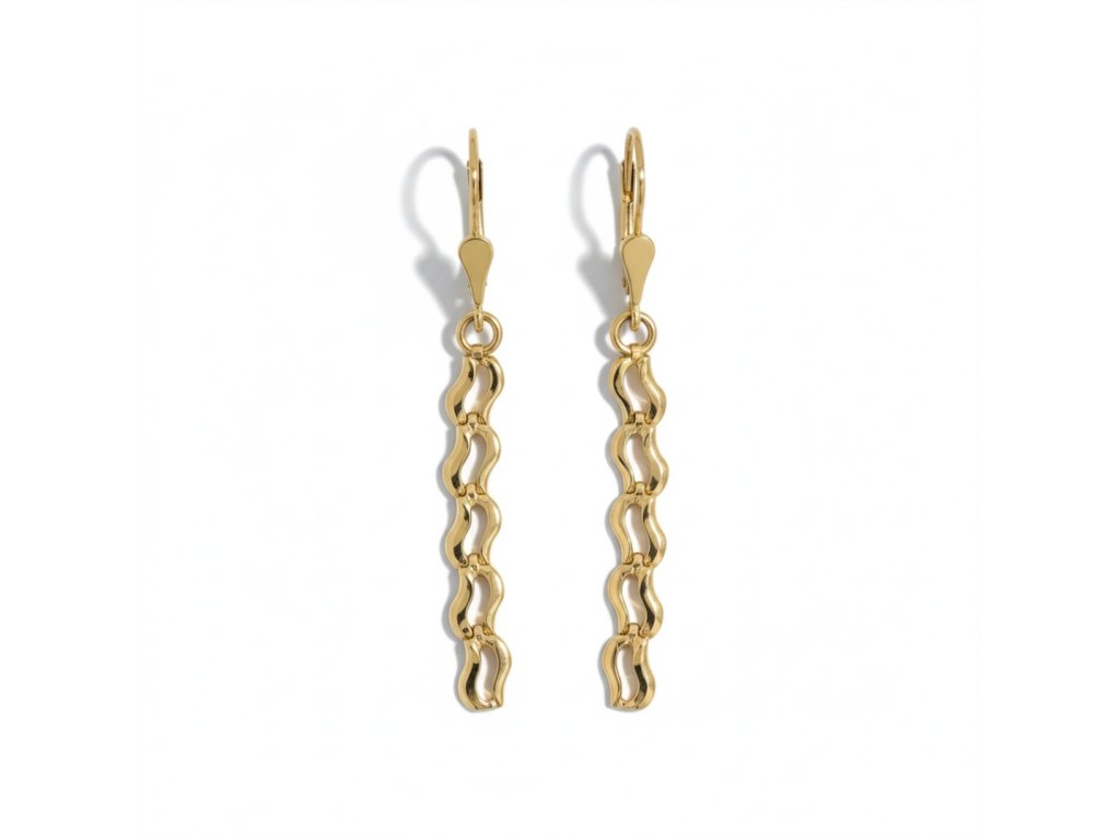 Elegantné visiace náušnice tvoria prepojené zlaté články usporiadané do tvaru jemných vĺn, ktoré sa pri pohybe krásne lesknú a prirodzene priťahujú pozornosť. Vďaka štíhlemu tvaru pôsobia ľahko a vzdušne, no zároveň dodajú outfitu výrazný detail.